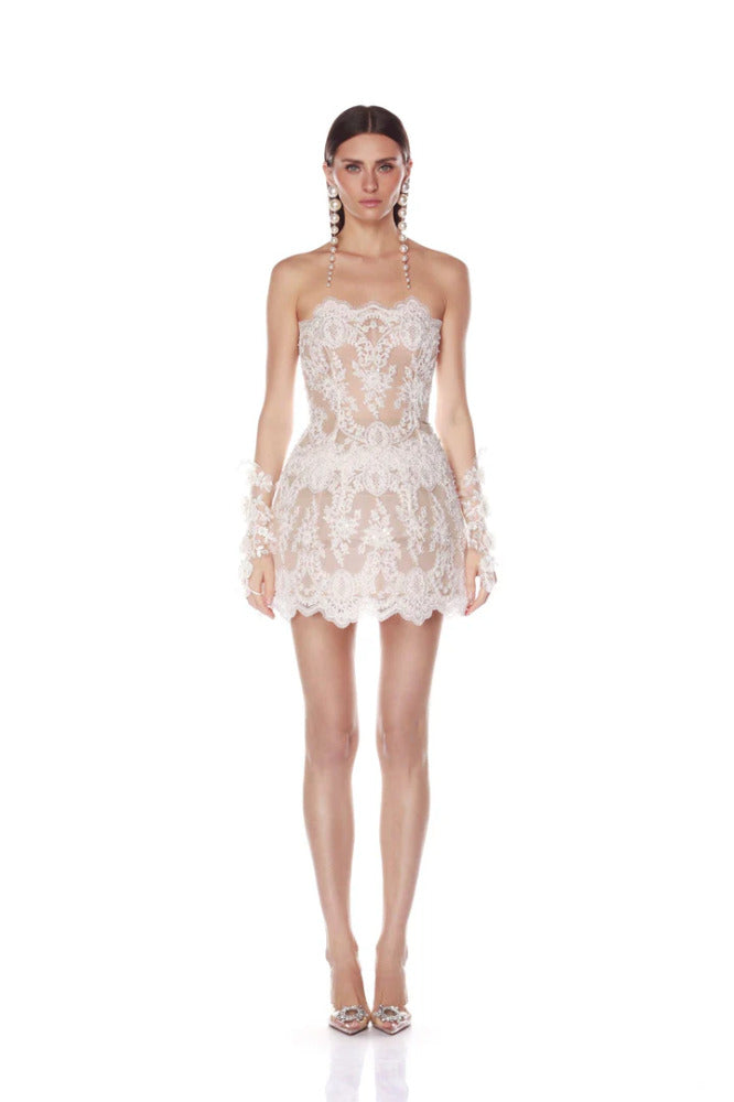 Dazzle in our Paris Maraya Blanc Lace Mini Dress, a touch of sophistication to your bridal ensemble.