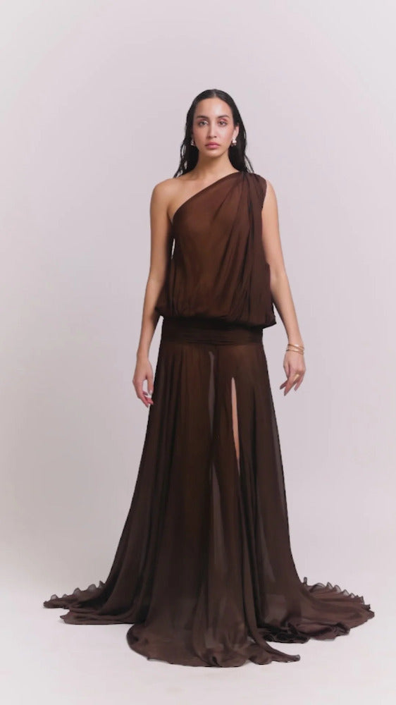 This elegant chiffon gown showcases a one-shoulder flouncy balloon top with a ruched panel at the drop waist, adding texture and enhancing the silhouette. The flowy skirt cascades beautifully, featuring a front side slit for a touch of allure and graceful movement. The lightweight chiffon material gives the gown a soft, ethereal quality, making it perfect for romantic or formal occasions.