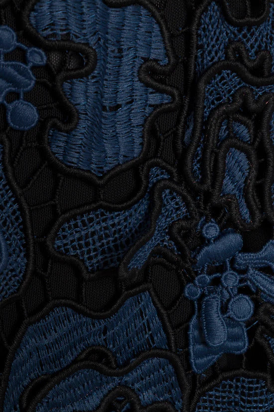 Rendered in coated guipure lace, this sleeveless silhouette features dimensional floral motifs and a delicate scoop neckline. Layered appliqué highlights the lace’s intricate texture, while a full length tonal lining provides coverage.
