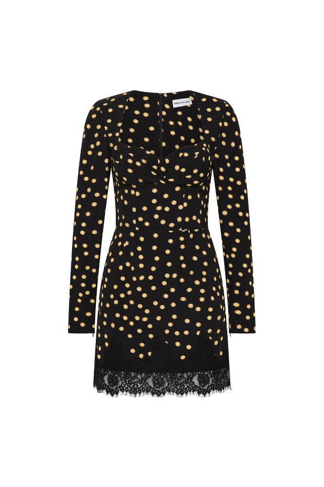 The Millie Mini Dress is effortlessly chic and charming in a black and yellow polka dot print, tailored from viscose crepe. Featuring a sweetheart neckline, the long sleeves and fitted bodice sculpt a feminine silhouette, elevated by a softly draped bust overlay. The fitted mini skirt is finished with an intricate scallop lace trim, while an invisible zip fastening at the back ensures a seamless fit. Fully lined for comfort, this dress is a playful yet sophisticated addition to your wardrobe.