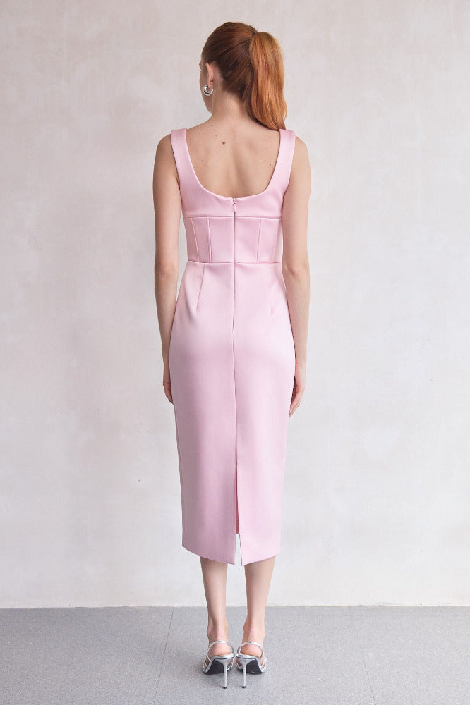 The Aymee Midi Dress in soft pink radiates feminine elegance, tailored from bonded satin. It features a sweetheart neckline and a fitted bodice with tucked soft cups, supported by thick straps for added comfort. Cinched at the waist, the pencil midi skirt shapes a flattering silhouette, enhanced with a back split for a touch of allure. Lined and secured with a zip fastening at the back, this dress is a sophisticated choice for your next event.