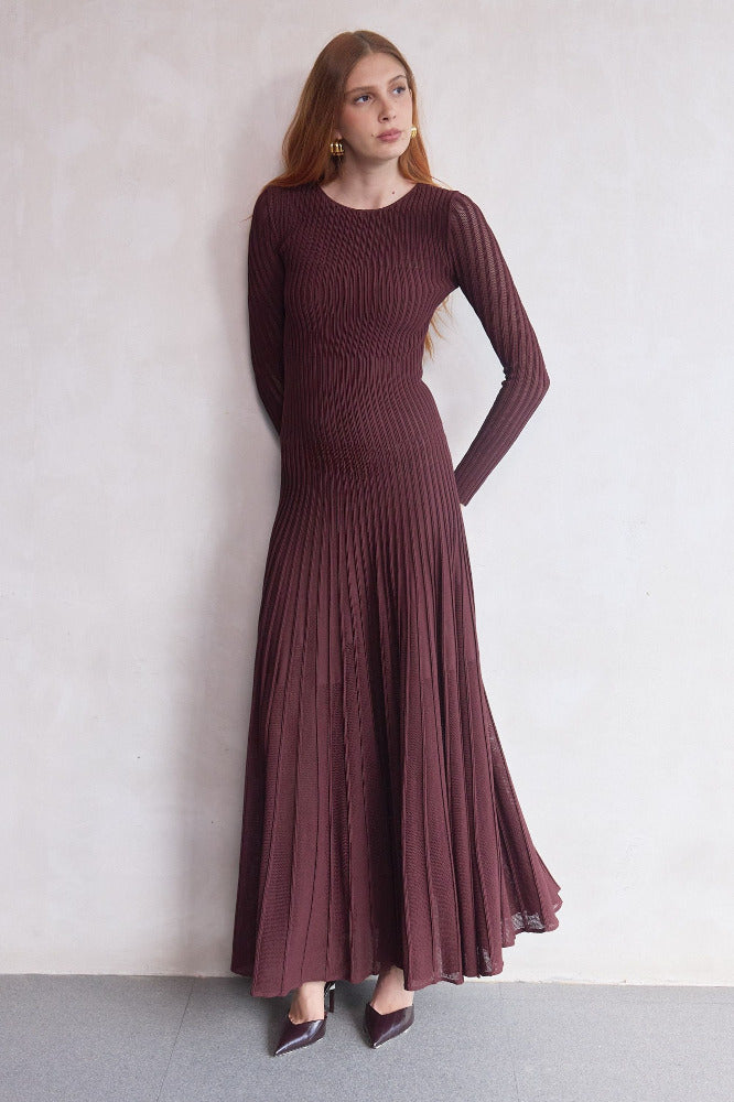 This dress is crafted in mesh pointelle with a mix of sheer and opaque stitches for a textured, dimensional look. Featuring a clean crew neckline and fitted long sleeves, it falls into a full maxi A-line skirt for soft, sweeping movement. A modern blend of structure and ease.