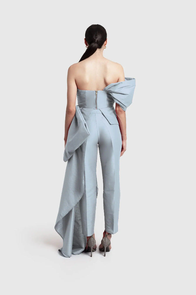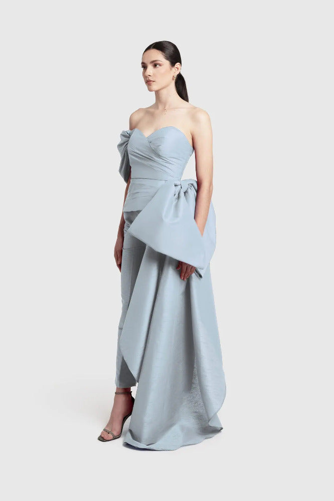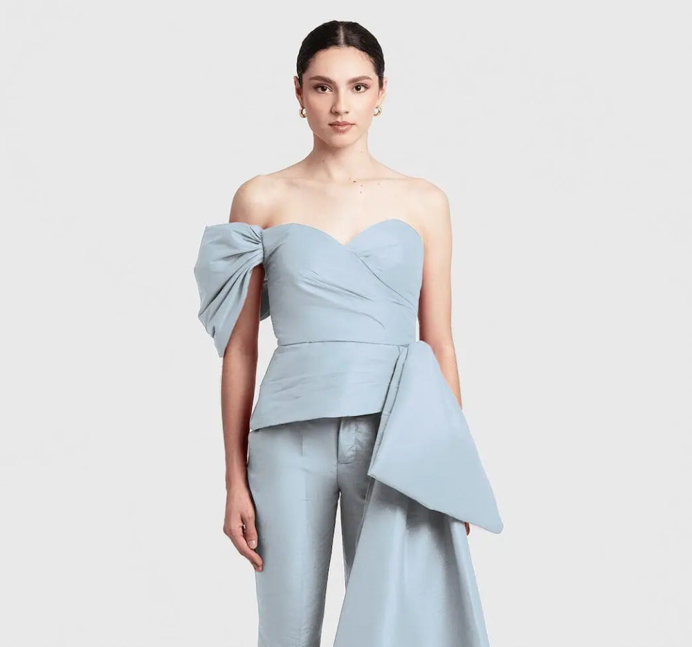 El “Monroe Top” es el indicado para una entrada triunfal. Presenta un top drapeado sin tirantes con un dramático moño al lado que cae hasta el suelo de forma dramática e intensa.